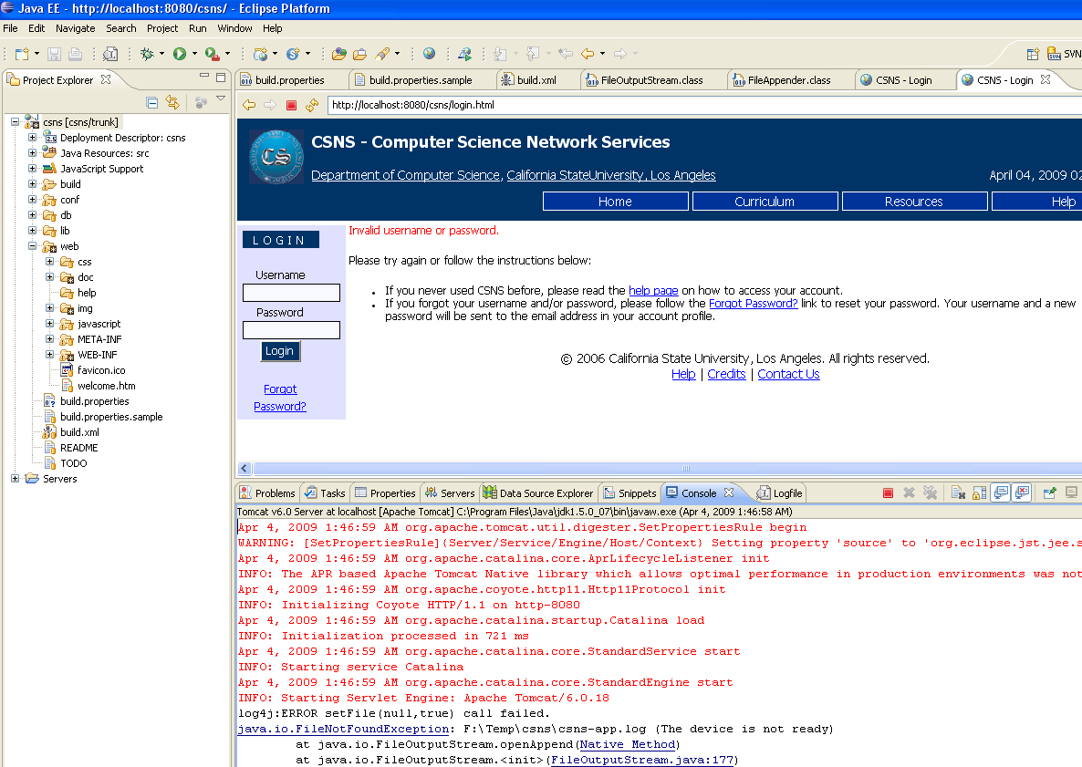 Look at the error message. It says something about not being able to find F:\Temp\csns\csns-app.log. Did you create the folders for log.dir and file.base.dir in build.properties? Last edited by cysun at
