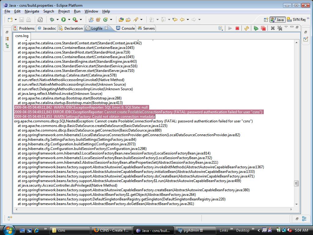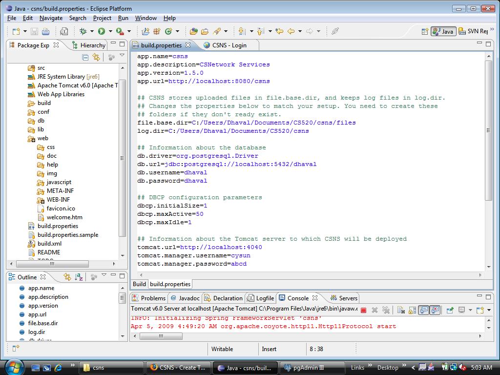 Your build.properties shows that the username for the database is "dhaval", but the error in the log file shows that it tried to connect to the database server using the username "csns". That's kind of odd. Try the following and see if it works: 1. Delete csns-data.xml under /web/WEB-INf. 2. Refresh the project. 3. Run As -> Run on Server. |