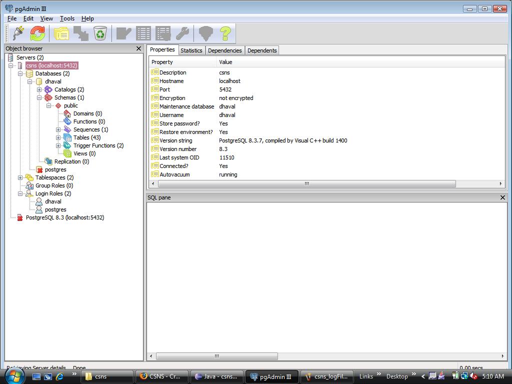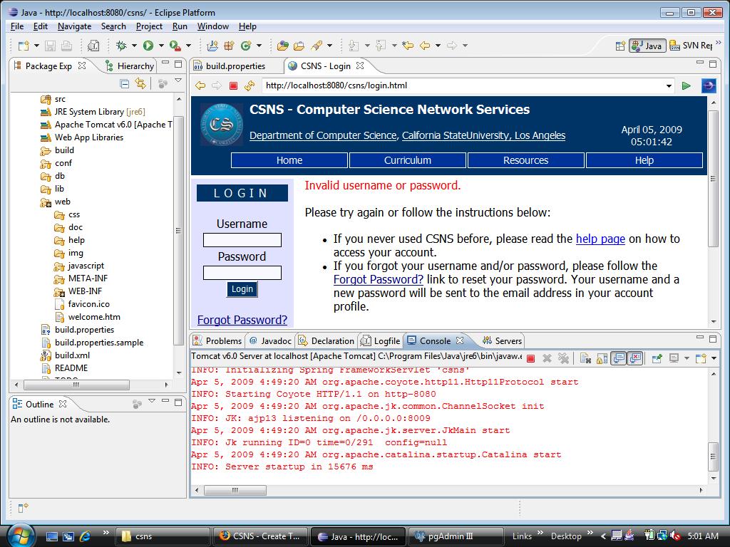 I am having trouble in login at localhost. I am using i0001 as a username and password. But still unable to login. Here, I am attaching following files. (I don't get any errors on console) 1:> login page 2:> Build.properties settings 3:> csns logFile [Highlighted the error which shows that password authentication failed for user 'csns' but there is no such user created.] 4:> pgAdmin3. Created roles in database. It's working for cs3.calstatela.edu. But don't know what is the problem locally. Last edited by dhavalpatels at
