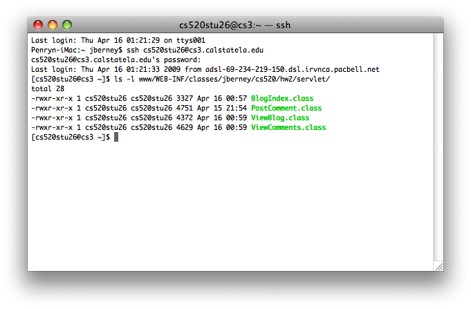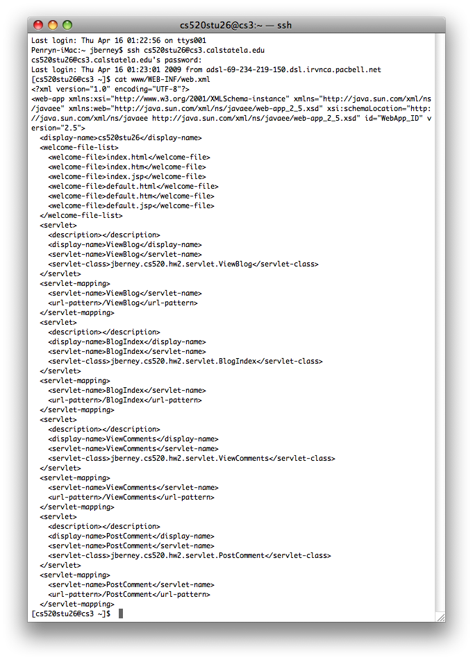 URL: http://cs3.calstatela.edu:8080/cs520stu12/ Ok, I think I got it to work at last. Here's what I tried: Regards, |