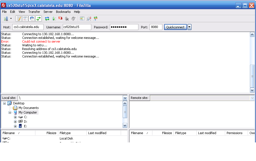 I am using filezilla to connect and using following: Server: cs3.calstatela.edu Port: 8080 username and password: As provided The program seems to establish connection and status says "Connection established, waiting for welcome message" but then results in Error "Could not connect to Server"...I am attaching screen shot aswell. I have not installed Putty as I dont think its needed for filezilla to work. Any advice ? Thanks |