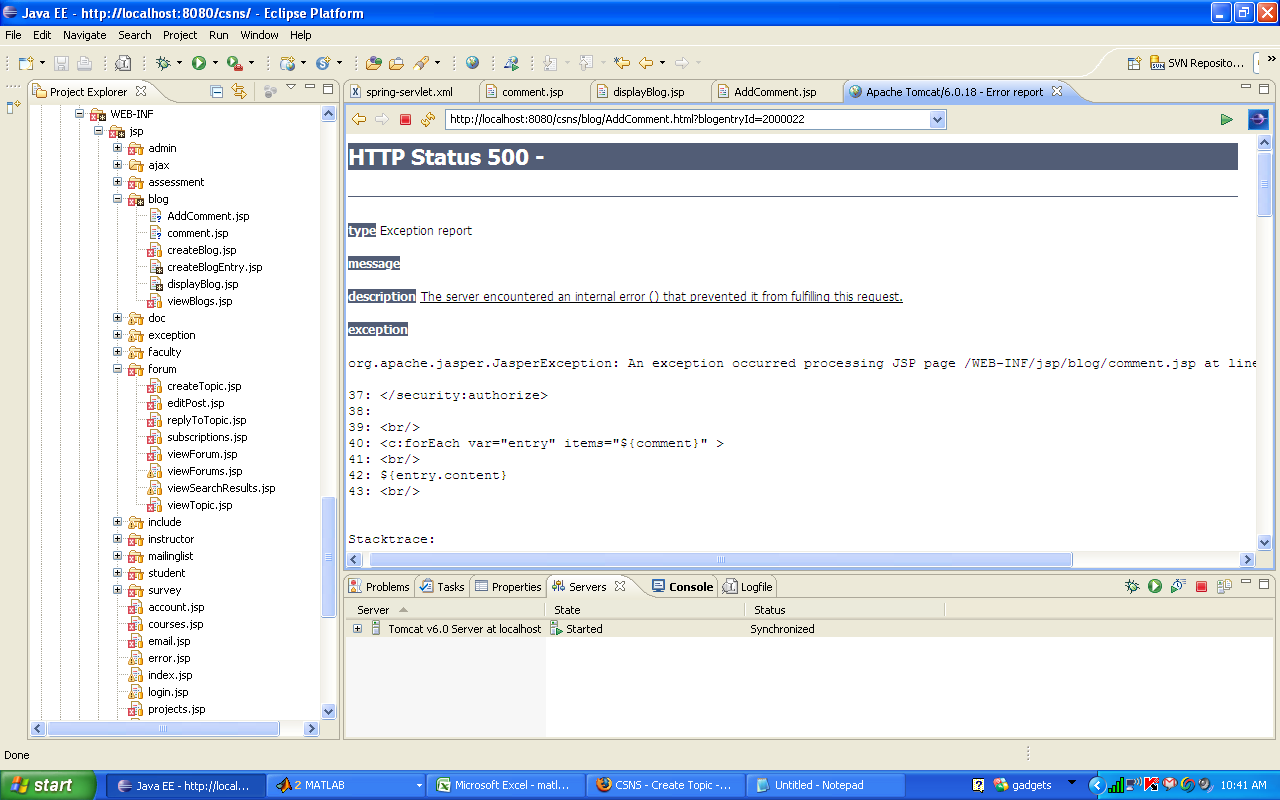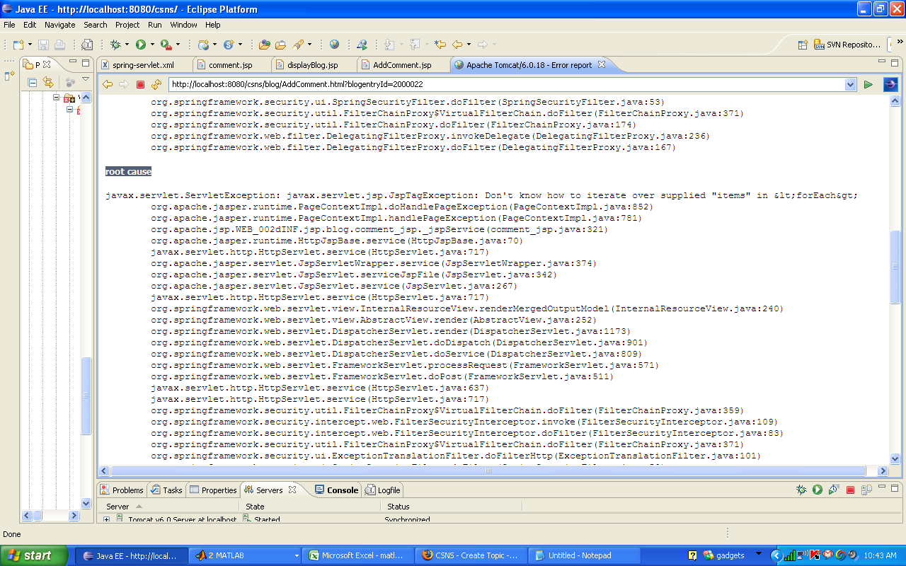 Hello, I am getting error while submitting comments to the database. Comments are stored in database when i click submit button but it given an error on comment.jsp page where i am displaying comments. org.apache.jasper.JasperException: An exception occurred processing JSP page /WEB-INF/jsp/blog/comment.jsp at line 40 37: </security:authorize> 38: 39: <br/> 40: <c:forEach var="entry" items="${comment}" > 41: <br/> 42: ${entry.content} 43: <br/>