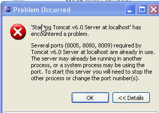hMailServer doesn't use port 8080 etc. It's likely that the problem was caused by a Tomcat instance that was not terminated properly. Close Eclipse, then in Windows Task Manager, under the Processes tab, kill all the processes that says "java.exe" or "javaw.exe". This should fix the problem. |