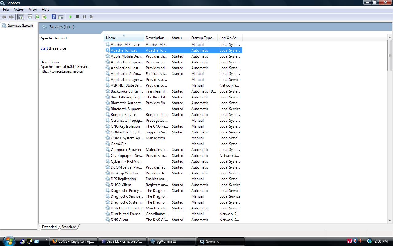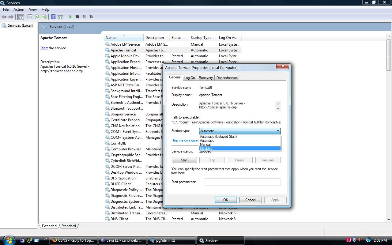 Well, I guess that your 8080 port is already assigned to some other tomcat server or service. Go to Services and try to stop that one. You can turn off auto start from its properties. Take a look at attached screenshots of my Vista Services Manager and property dialog box. I have to do all the time when I restart Windows. I have one Installed Tomcat Server and I have other Tomcat for CSNS Eclipse Workspace sepratly. I hope that this should work otherwise try to google it. Last edited by jadiagaurang at