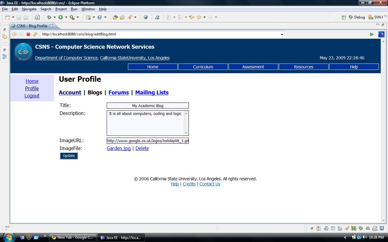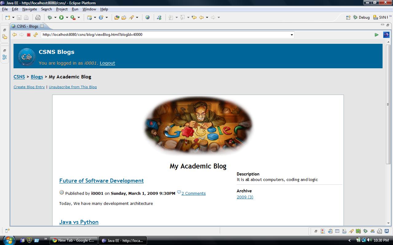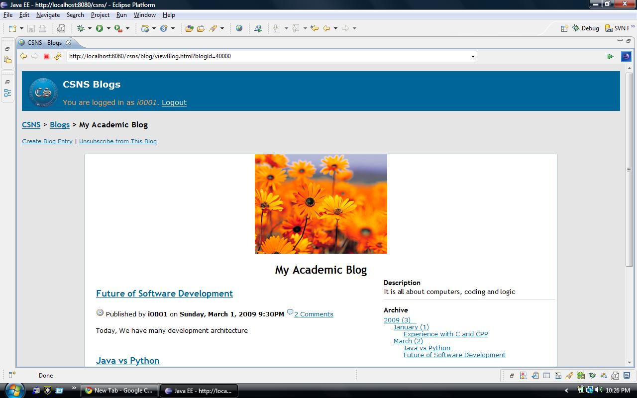I want to allow user to delete Blog Image, which was uploaded by user. I have seen few example like DeletePostAttachmentController. In this controller attachments are saved as Set of Files. This controller has something like post.getAttachments().remove( attachment ); to remove file from Set and then save object of post! (I am going to use this code to delete attachments from BlogEntries and Comments.) I have imageFile a property of Blog. I set imageFile equals to null when user delete imageFile. I guess when object has null value Garbage Collector delete from memory. It is working also, but problem is that file does not removed from physical drive! Is it OK or I am doing something wrong? Check out my screenshots? Secondly, I have seen in most of blog applications that BlogEntry can have one category and many tags. It is useful to sort and orgnize BlogEntries. Every blog should have one calendar component to display posting dates of BlogEntries. Should we do like these to make our CSNS Blogs more realistic? |