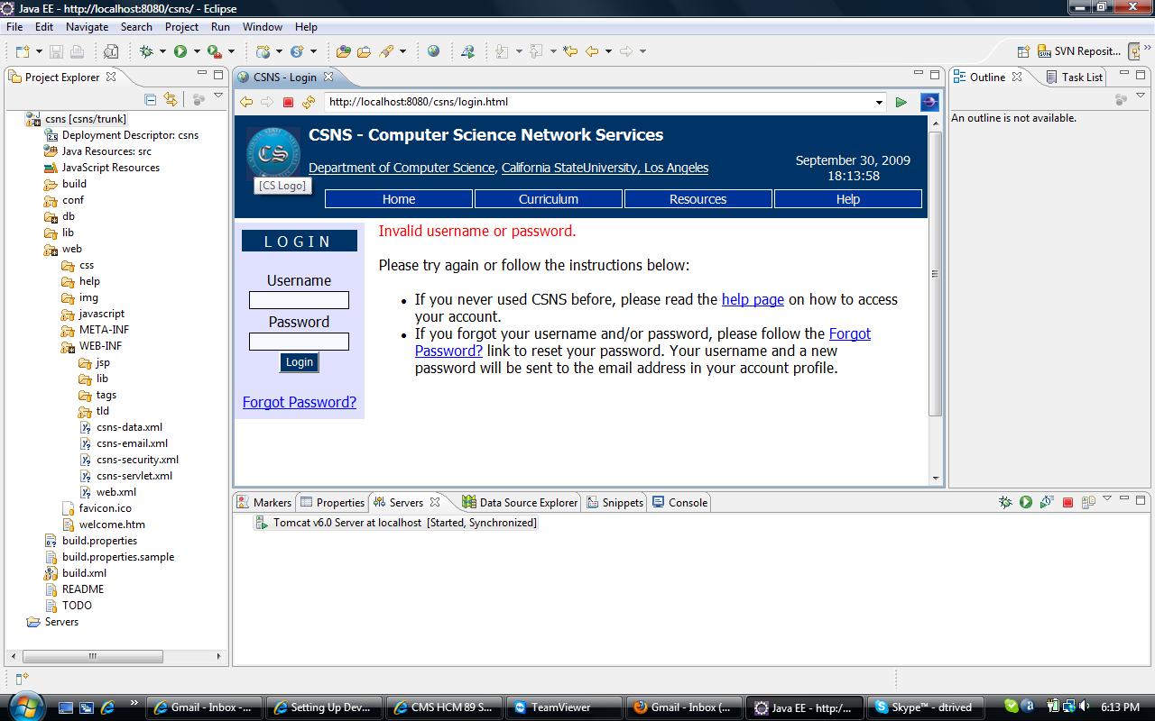 Hello trivedidr, As Guanhua mentioned that you need to have same user id and password. For example; Username: i0001 and Password: i0001 and as Dr. Sun mentioned that you need to check your build.xml file for correct connection information, like name of database, username and password for PostgreSQL. I believe that you should check that which sql file did you insert in your database. You should insert "csns-test-insert.sql" because there is one other insert file in db folder. I wish you will solve this error. Good luck... PS: I am not in this class this quarter but I was in Spring 2009. |