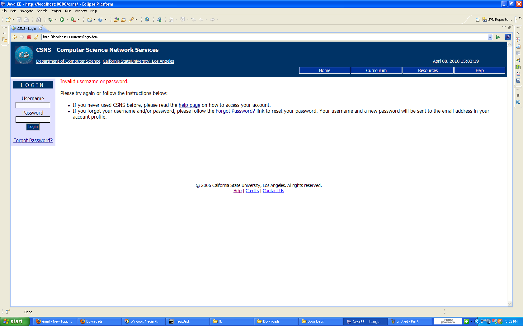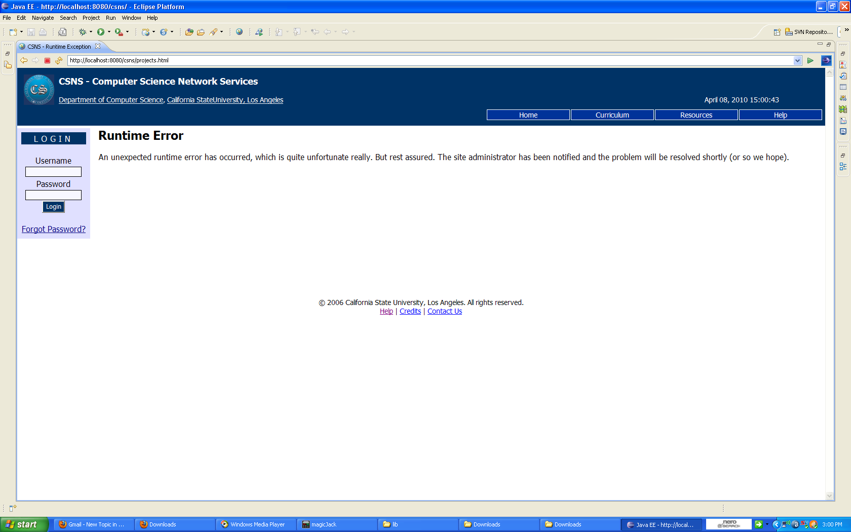 I am able to get the welcome page in the web browser in Eclipse but instead of the welcome message there is a run time error message (Please see attached). Also, I couldn't login using ixxxx/sxxxx.