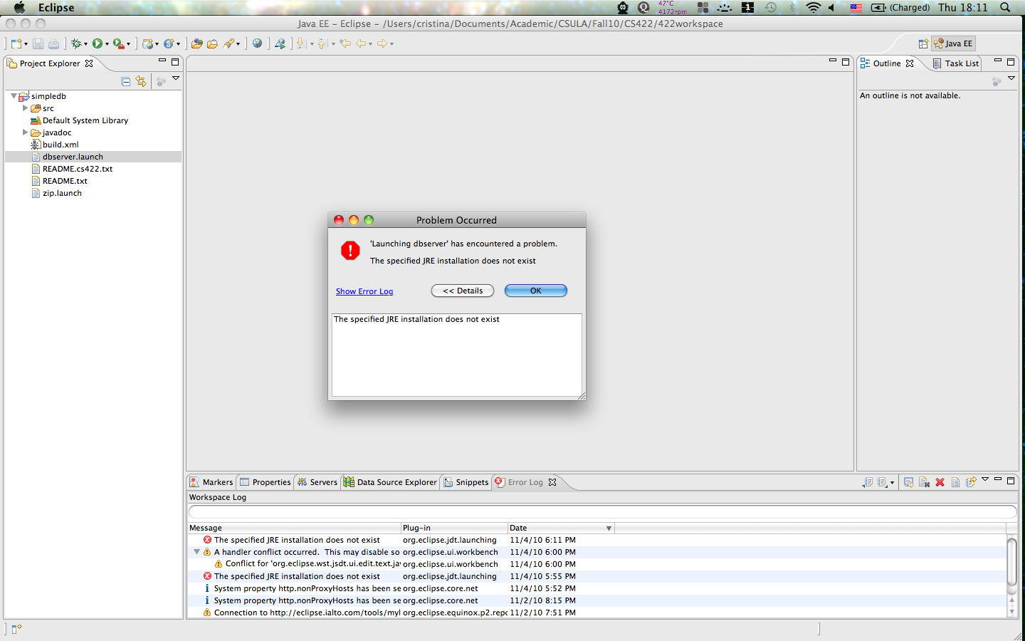 I have setup SimpleDB using the steps outlined on the course web page but am not able to start the SimpleDB server. Below are screenshots of the errors I am receiving when I try to start the server. The first shows the error message "The specified JRE installation does not exist". The second shows the error "Build path entry is missing: org.eclipse.jdt.launching.JRE_CONTAINER". Please let me know what steps I should take to resolve these errors. Please note that I am using JDK 1.6.