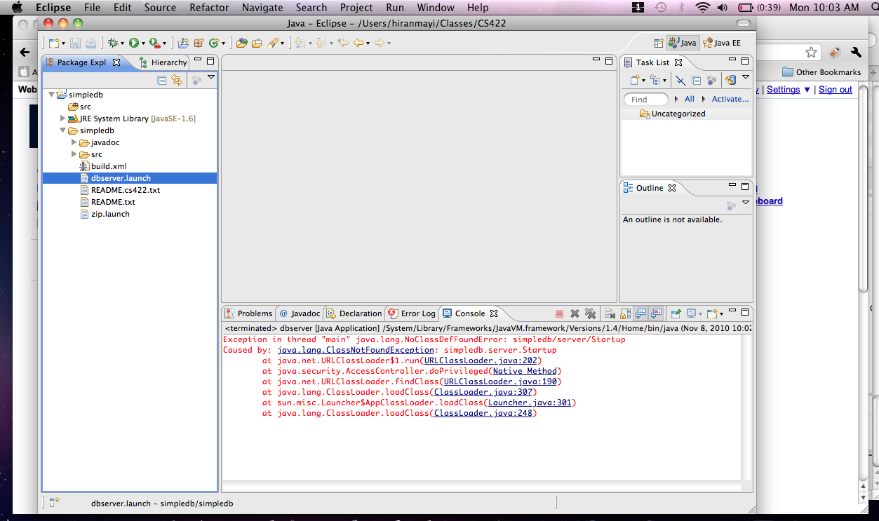 4. Go to the folder of the simpledb project, open the .classpath file there, and replace the path of <classpathentry kind="con"> with the value in the previous project. 5. Start Eclipse, refresh the simpledb project and try again. |