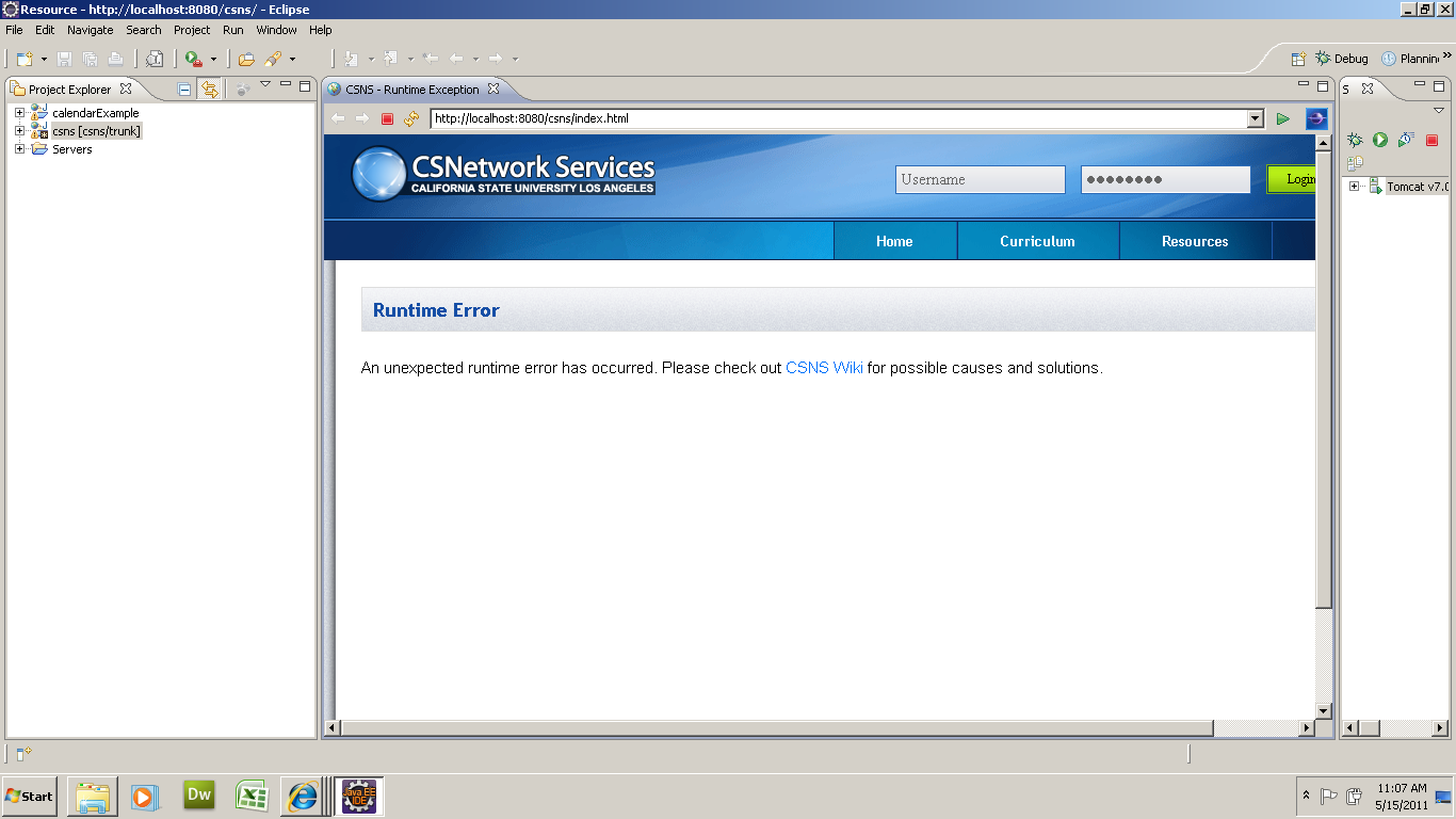 pleass attachment, CSNS website is luanched , however it is redirect to Runtime error page See log: May 15, 2011 11:07:02 AM org.apache.catalina.core.AprLifecycleListener init INFO: The APR based Apache Tomcat Native library which allows optimal performance in production environments was not found on the java.library.path: C:\Program Files\Java\jdk1.6.0_22\bin;.;C:\windows\Sun\Java\bin;C:\windows\system32;C:\windows;C:/Program Files/Java/jdk1.6.0_22/bin/../jre/bin/client;C:/Program Files/Java/jdk1.6.0_22/bin/../jre/bin;C:/Program Files/Java/jdk1.6.0_22/bin/../jre/lib/i386;C:\Program Files\Java\jdk1.6.0_22\bin;C:\Program Files\PC Connectivity Solution\;C:\windows\system32;C:\windows;C:\windows\System32\Wbem;C:\windows\System32\WindowsPowerShell\v1.0\;c:\Program Files\Microsoft SQL Server\90\Tools\binn\;C:\Program Files\Lenovo\Bluetooth Software\;c:\Program Files\Microsoft SQL Server\100\Tools\Binn\;c:\Program Files\Microsoft SQL Server\100\DTS\Binn\;c:\Program Files\Microsoft SQL Server\100\Tools\Binn\VSShell\Common7\IDE\;C:\Program Files\MySQL\MySQL Server 5.1\bin;C:\Program Files\Java\jdk1.6.0_22\bin;C:\apache-ant-1.8.2\bin; May 15, 2011 11:07:03 AM org.apache.tomcat.util.digester.SetPropertiesRule begin WARNING: [SetPropertiesRule]{Server/Service/Engine/Host/Context} Setting property 'source' to 'org.eclipse.jst.jee.server:calendarExample' did not find a matching property. May 15, 2011 11:07:03 AM org.apache.tomcat.util.digester.SetPropertiesRule begin WARNING: [SetPropertiesRule]{Server/Service/Engine/Host/Context} Setting property 'source' to 'org.eclipse.jst.jee.server:csns' did not find a matching property. May 15, 2011 11:07:03 AM org.apache.coyote.AbstractProtocolHandler init INFO: Initializing ProtocolHandler ["http-bio-8080"] May 15, 2011 11:07:03 AM org.apache.coyote.AbstractProtocolHandler init INFO: Initializing ProtocolHandler ["ajp-bio-8009"] May 15, 2011 11:07:03 AM org.apache.catalina.startup.Catalina load INFO: Initialization processed in 532 ms May 15, 2011 11:07:03 AM org.apache.catalina.core.StandardService startInternal INFO: Starting service Catalina May 15, 2011 11:07:03 AM org.apache.catalina.core.StandardEngine startInternal INFO: Starting Servlet Engine: Apache Tomcat/7.0.12 May 15, 2011 11:07:04 AM org.apache.catalina.startup.TaglibUriRule body INFO: TLD skipped. URI: http://java.sun.com/jstl/core_rt is already defined May 15, 2011 11:07:04 AM org.apache.catalina.startup.TaglibUriRule body INFO: TLD skipped. URI: http://java.sun.com/jstl/core is already defined May 15, 2011 11:07:04 AM org.apache.catalina.startup.TaglibUriRule body INFO: TLD skipped. URI: http://java.sun.com/jsp/jstl/core is already defined May 15, 2011 11:07:04 AM org.apache.catalina.startup.TaglibUriRule body INFO: TLD skipped. URI: http://java.sun.com/jstl/fmt_rt is already defined May 15, 2011 11:07:04 AM org.apache.catalina.startup.TaglibUriRule body INFO: TLD skipped. URI: http://java.sun.com/jstl/fmt is already defined May 15, 2011 11:07:04 AM org.apache.catalina.startup.TaglibUriRule body INFO: TLD skipped. URI: http://java.sun.com/jsp/jstl/fmt is already defined May 15, 2011 11:07:04 AM org.apache.catalina.startup.TaglibUriRule body INFO: TLD skipped. URI: http://java.sun.com/jsp/jstl/functions is already defined May 15, 2011 11:07:04 AM org.apache.catalina.startup.TaglibUriRule body INFO: TLD skipped. URI: http://jakarta.apache.org/taglibs/standard/permittedTaglibs is already defined May 15, 2011 11:07:04 AM org.apache.catalina.startup.TaglibUriRule body INFO: TLD skipped. URI: http://jakarta.apache.org/taglibs/standard/scriptfree is already defined May 15, 2011 11:07:04 AM org.apache.catalina.startup.TaglibUriRule body INFO: TLD skipped. URI: http://java.sun.com/jstl/sql_rt is already defined May 15, 2011 11:07:04 AM org.apache.catalina.startup.TaglibUriRule body INFO: TLD skipped. URI: http://java.sun.com/jstl/sql is already defined May 15, 2011 11:07:04 AM org.apache.catalina.startup.TaglibUriRule body INFO: TLD skipped. URI: http://java.sun.com/jsp/jstl/sql is already defined May 15, 2011 11:07:04 AM org.apache.catalina.startup.TaglibUriRule body INFO: TLD skipped. URI: http://java.sun.com/jstl/xml_rt is already defined May 15, 2011 11:07:04 AM org.apache.catalina.startup.TaglibUriRule body INFO: TLD skipped. URI: http://java.sun.com/jstl/xml is already defined May 15, 2011 11:07:04 AM org.apache.catalina.startup.TaglibUriRule body INFO: TLD skipped. URI: http://java.sun.com/jsp/jstl/xml is already defined May 15, 2011 11:07:04 AM org.apache.catalina.core.ApplicationContext log INFO: Set web app root system property: 'csns.root' = [C:\Users\aryan\workspace\cs520\hw1\.metadata\.plugins\org.eclipse.wst.server.core\tmp1\wtpwebapps\csns\] May 15, 2011 11:07:04 AM org.apache.catalina.core.ApplicationContext log INFO: Initializing log4j from [C:\Users\aryan\workspace\cs520\hw1\.metadata\.plugins\org.eclipse.wst.server.core\tmp1\wtpwebapps\csns\WEB-INF\classes\log4j.xml] May 15, 2011 11:07:04 AM org.apache.catalina.core.ApplicationContext log INFO: Initializing Spring root WebApplicationContext May 15, 2011 11:07:08 AM org.apache.catalina.core.ApplicationContext log INFO: Initializing Spring FrameworkServlet 'csns' May 15, 2011 11:07:11 AM org.apache.coyote.AbstractProtocolHandler start INFO: Starting ProtocolHandler ["http-bio-8080"] May 15, 2011 11:07:11 AM org.apache.coyote.AbstractProtocolHandler start INFO: Starting ProtocolHandler ["ajp-bio-8009"] May 15, 2011 11:07:11 AM org.apache.catalina.startup.Catalina start INFO: Server startup in 7815 ms |
