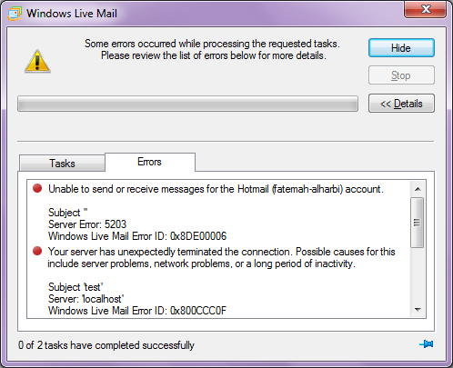 Dear professor, I finished setting up a local email testing. When I try to send an email I get an error using Windows Live Mail. Please see the attached file. |