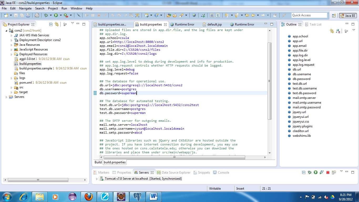 LOG FILE ERROR MSG: 2012-09-28 19:46:00,490 WARN JdbcServicesImpl: HHH000342: Could not obtain connection to query metadata : FATAL: password authentication failed for user "postgres"