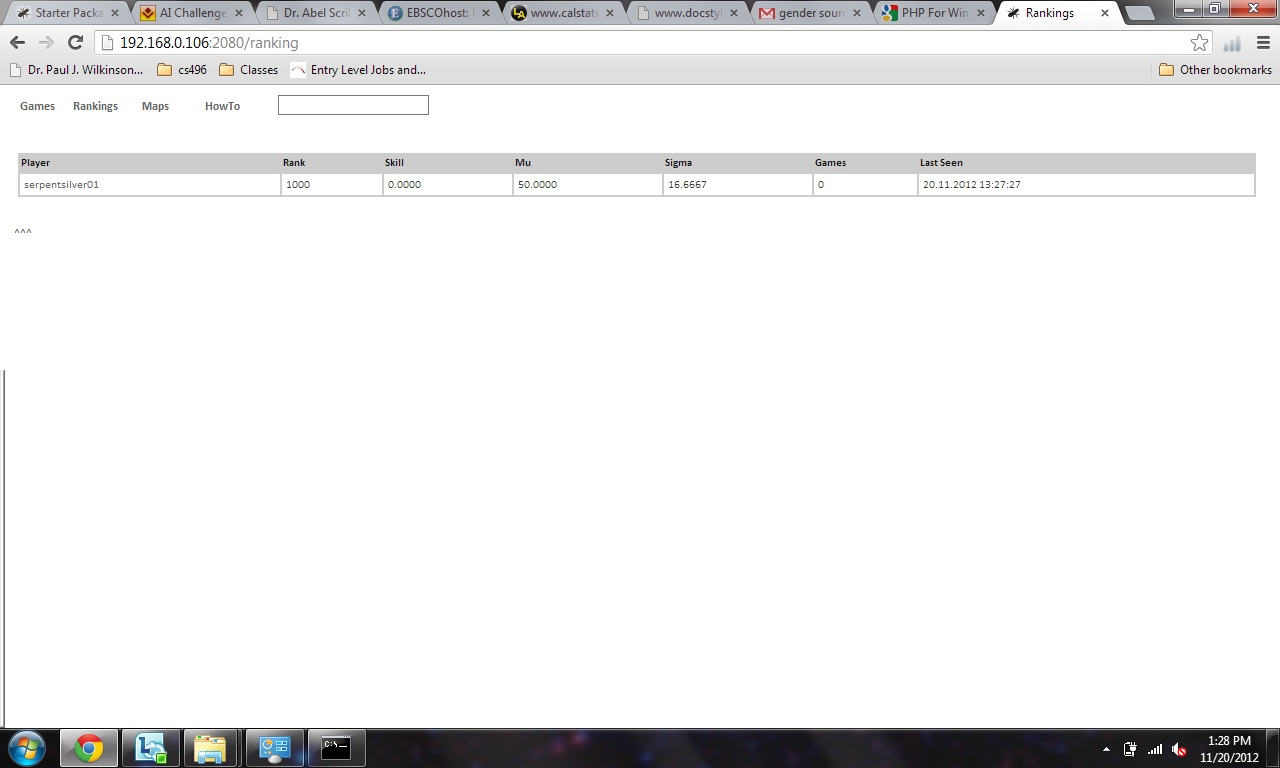 So it works do I get an A++. heheh. :) So to get it to work install python 2.72 86x version install and setup IIS with CGI. install php 5.3 with fastCGI. run tcpserver.py and webserver.py create cmd with python tcpclient.py host_ulr 2081 "python MyBot .py" username password [num_rounds] replace host_ulr with the server ip or ulr the python bot with the bot you want to use and chose a username and password to use for the ranking and the num of rounds to run. you can see my server at http://home888.myq-see.com:2080/ Last edited by rabbott at