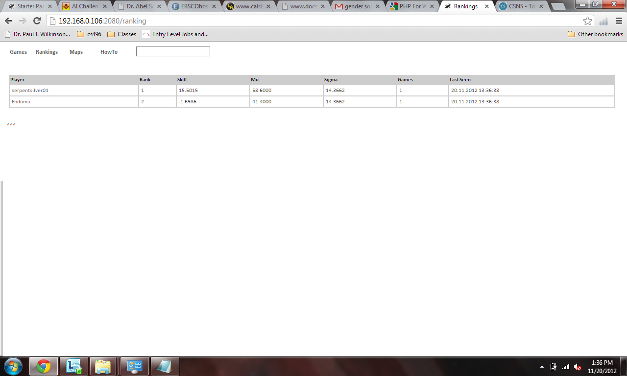 I appreciate your spending time investigating this. I'm still not sure how it would work, though. Would we run it on your computer? (Or on mine? Or on a school server?) How would the bots be entered? Would you (or I) have to do that manually? Once all the bots are loaded, is there anything else to do other than issuing a command for it to start? After that do you just look at the results periodically to see how they are working out? That is, will it just keep running games indefinitely and automatically revise the skill scores after each game? |