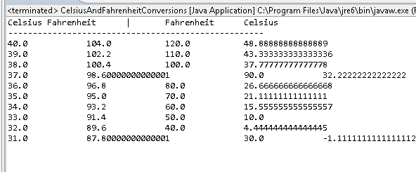 Since your methods are returning values, you shouldn't use printf inside those conversion methods. You would want to use it when you call your method from the main method. If you can't figure out how to format the values using printf then don't worry about it. The main objective here is to write two methods and then use a loop to print the table using calls of both methods. |