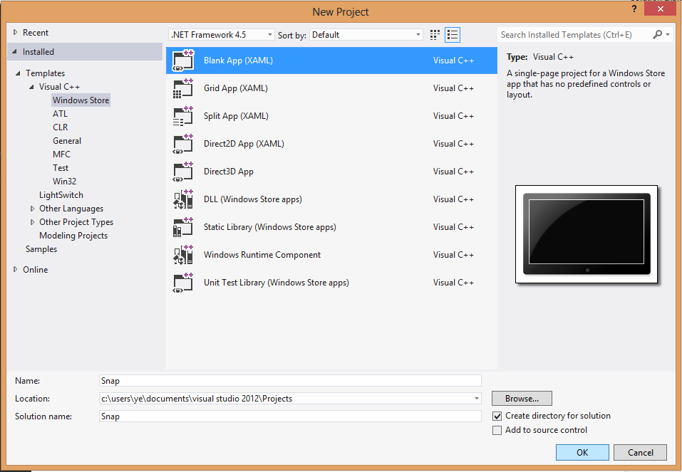 I know you all been eager to find out how to do add snap to your app in Visual Studio. Here's how to do it. Let's start by creating a blank app project. I will name the project Snap.