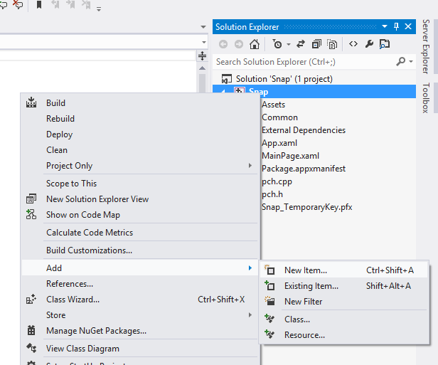 In the Solution Explorer, right click Snap(project)-->Add-->New Item...(or just press Ctrl+Shift+A)