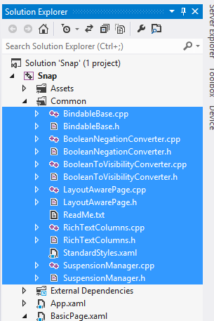 Since the MainPage.xaml doesn't support snap we can make the app load the BasicPage.xaml instead of MainPage.xaml by editing the App.xaml.cpp. In App.xaml.cpp replace MainPage with BasicPage. Note: there are 3 MainPage that needs to be changed, first one is the #include. You can delete MainPage.xaml and MainPage.xaml.cpp from the project.
