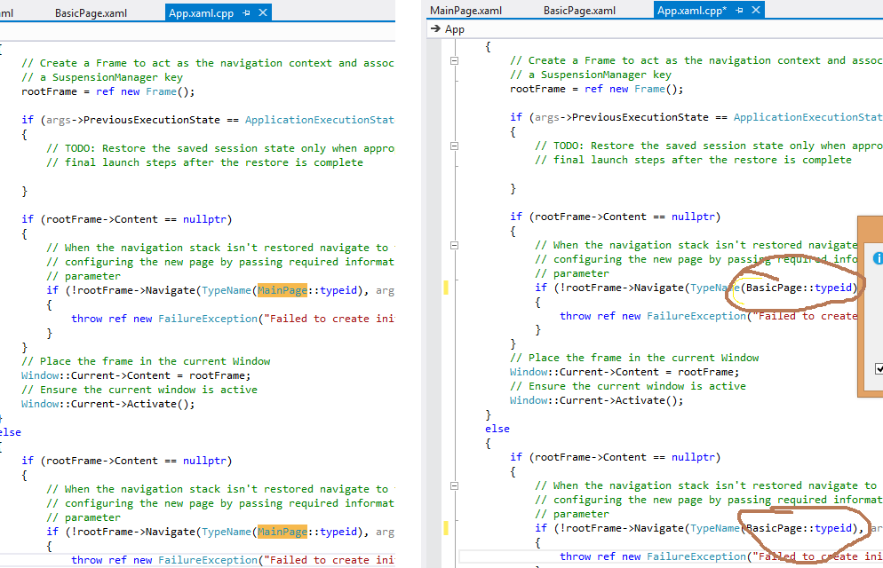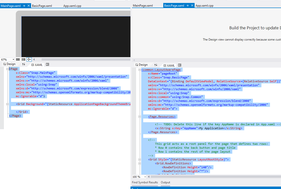 Comparing the MainPage.xaml and BasicPage.xaml, you can spot the huge difference in the code.