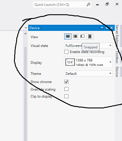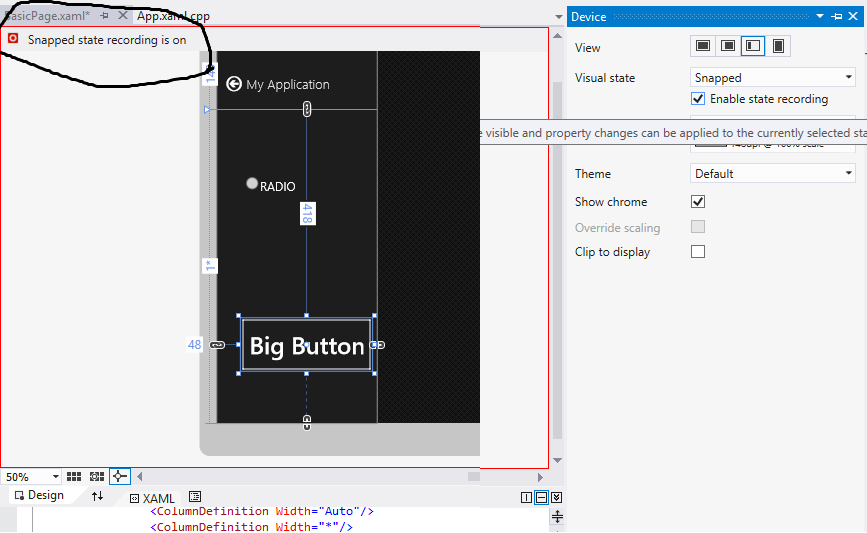 Now click the 3rd button the row of View for the snap view and check the box for Enable state recording. On the top left you will see that it will say, State recording is now on. This is when you start moving your buttons and stuff that you want to go into the snapped area. When you are done moving the buttons, uncheck the Enable state recording box. Now you can go back to FullScreen view to edit where the buttons and stuff goes, this part is doesn't need to have state recording. You can now run the app. Full Screen View: