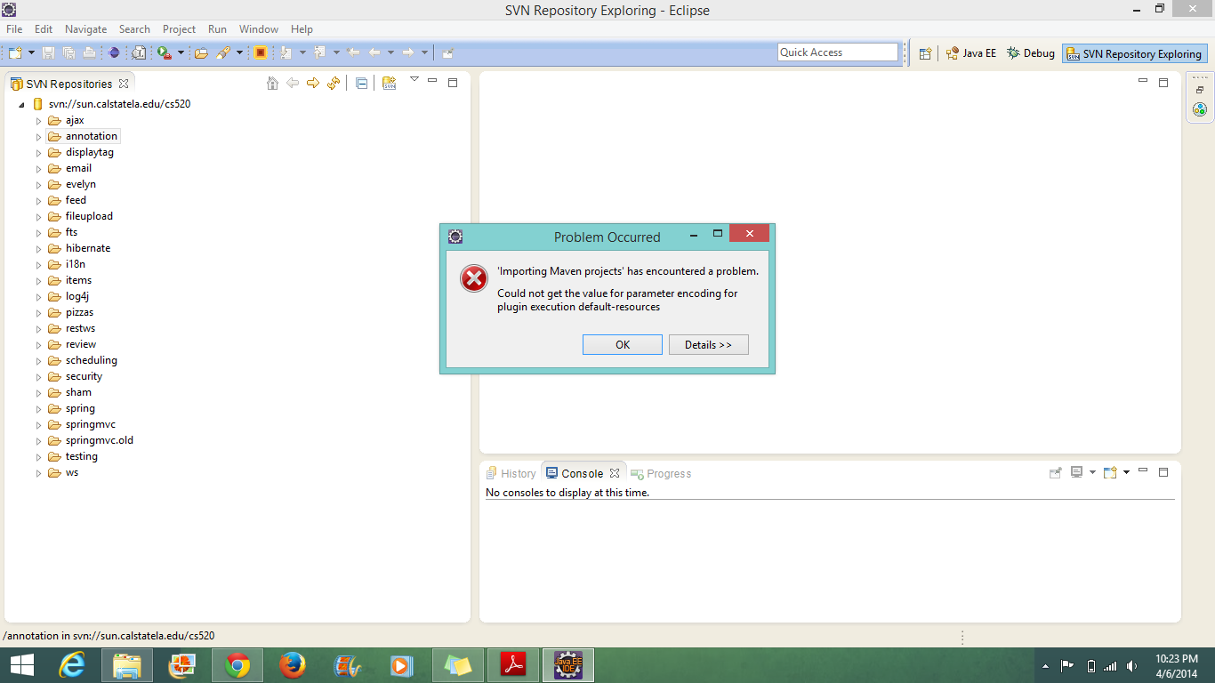 Hello Professor, I have installed all software and plugins as mentioned in csns. I am facing an error while trying to check out project as maven project in SVN repository. I am attaching a snapshot. My Configuration : JDK 7 update 0 Eclipse JUNO servlet 3.0 Tomcat Apache 7.0.47 Last edited by cshah6 at
