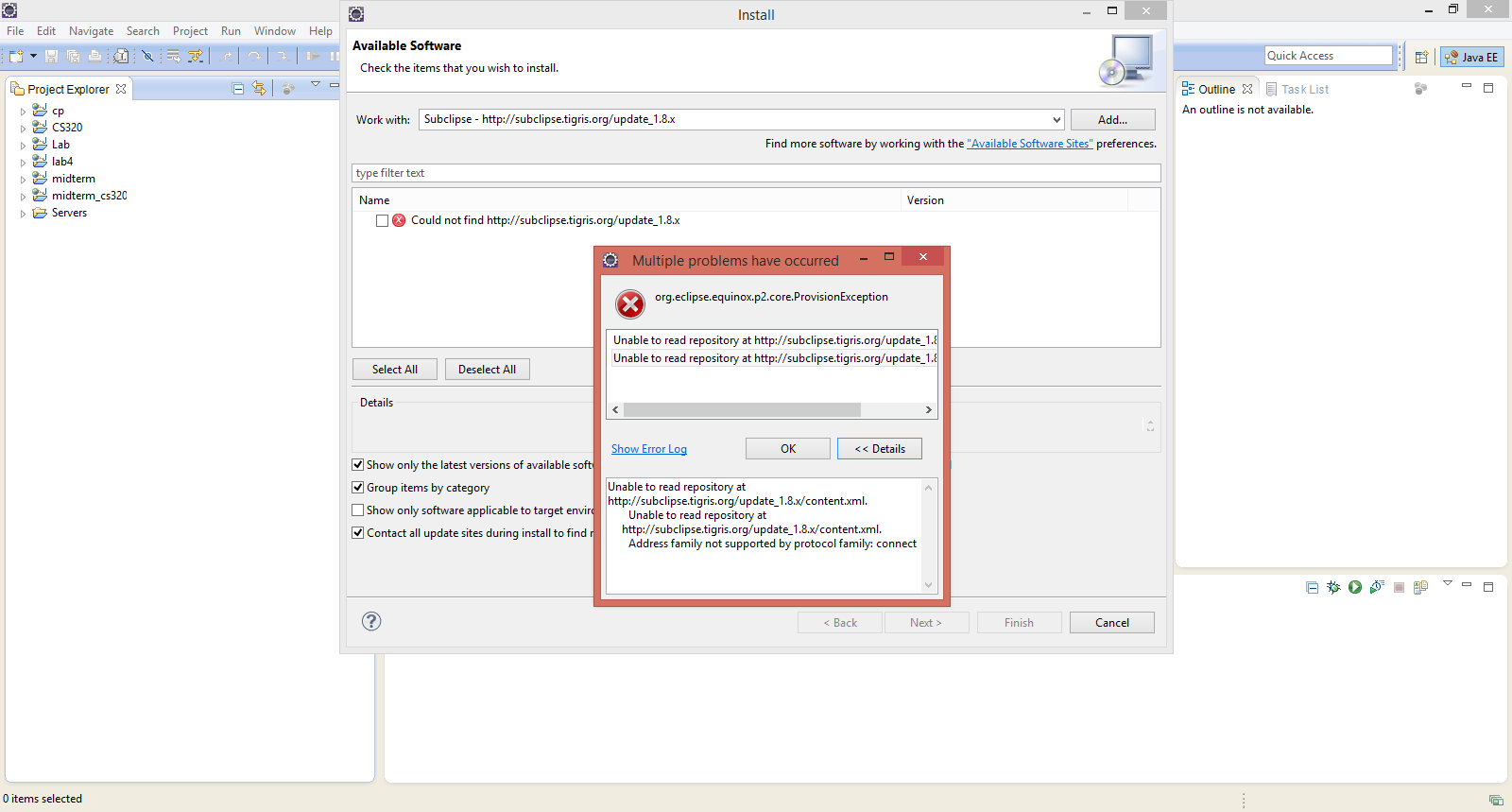 In Eclipse to install any plugin we need our Eclipse to connect to internet. But it's giving Error : Unable to read repository at http://subclipse.tigris.org/update_1.8.x/content.xml.