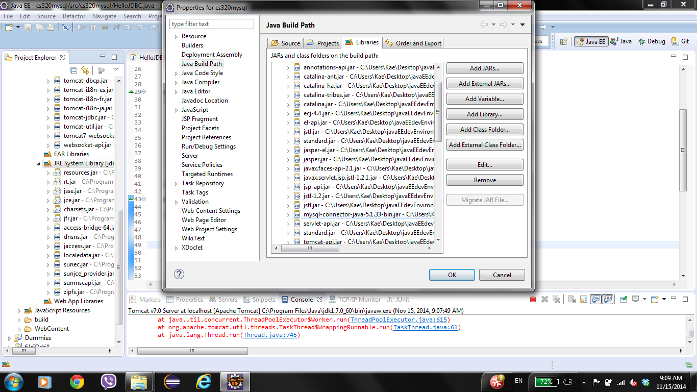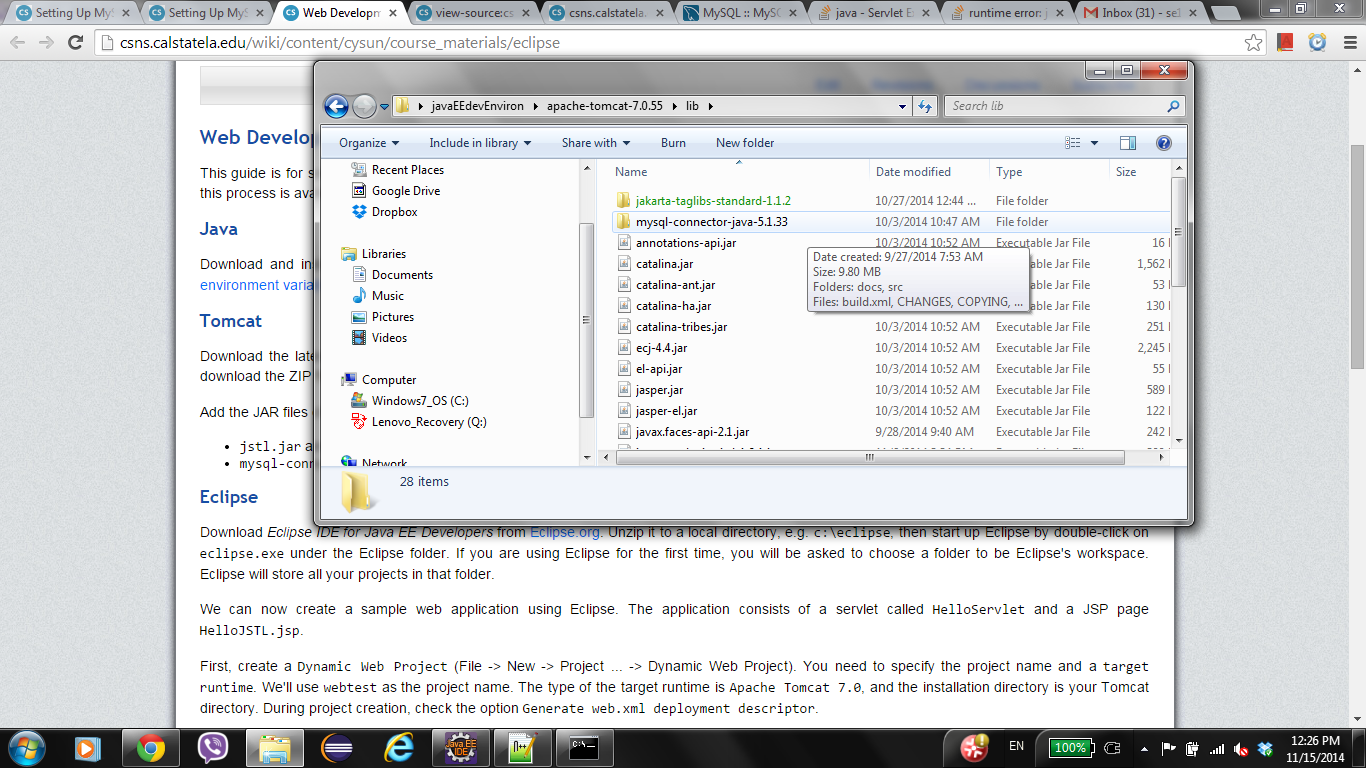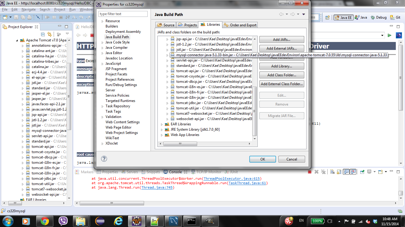 I have mysql-connector-java-5.1.33\mysql-connector-java-5.1.33-bin.jar in apache-tomcat-7.0.55\lib\, and it shows up on my Eclipse Project Explorer under the Dynamic Web Project folder where I have my HelloJDBC.java which is from our course website (Please see the attachment), but when I run the servlet, I get 500 error (I also see the Driver.class under com.mysql.jdbc package under mysql-connector-java-5.1.33-bin.jar):