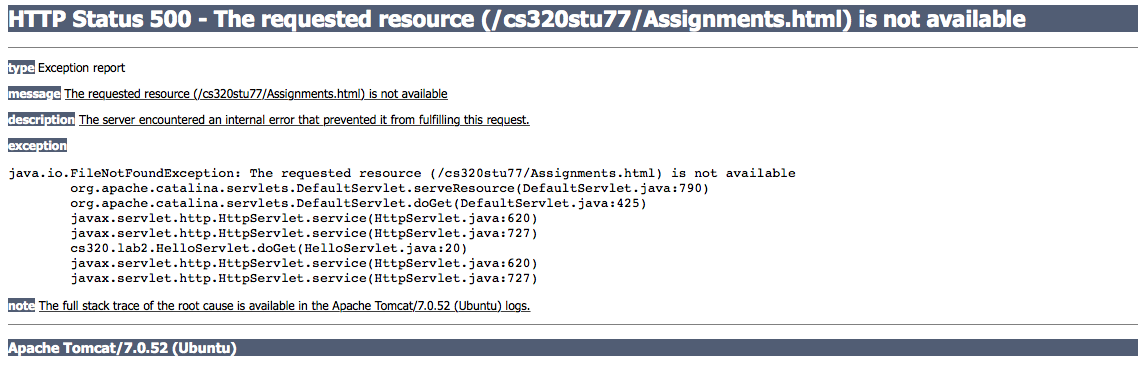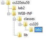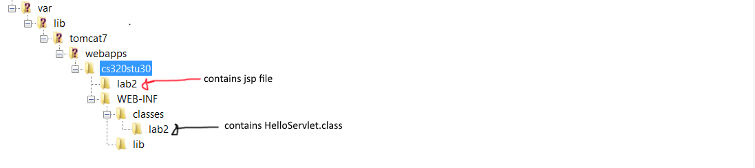 This is what I have in filezilla, I followed the instructions. This is my link for the JSP, and it works fine. http://cs3.calstatela.edu:8080/cs320stu77/lab2/HelloJSTL.jsp but my Servlet doesn't work http://cs3.calstatela.edu:8080/cs320stu77/lab2/HelloServlet |