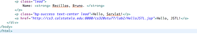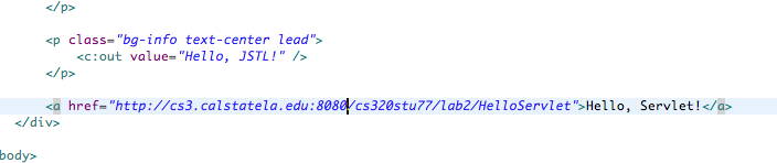 I have this: http://localhost:8080/CS320/lab2/HelloServlet and http://localhost:8080/CS320/lab2/HelloJSTL.jsp |
