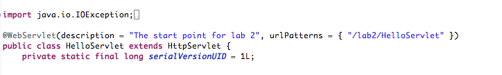 Here I attach a photo of the mapping at the top of the HelloServlet.java the package for the servlet is cs320.lab2 |
