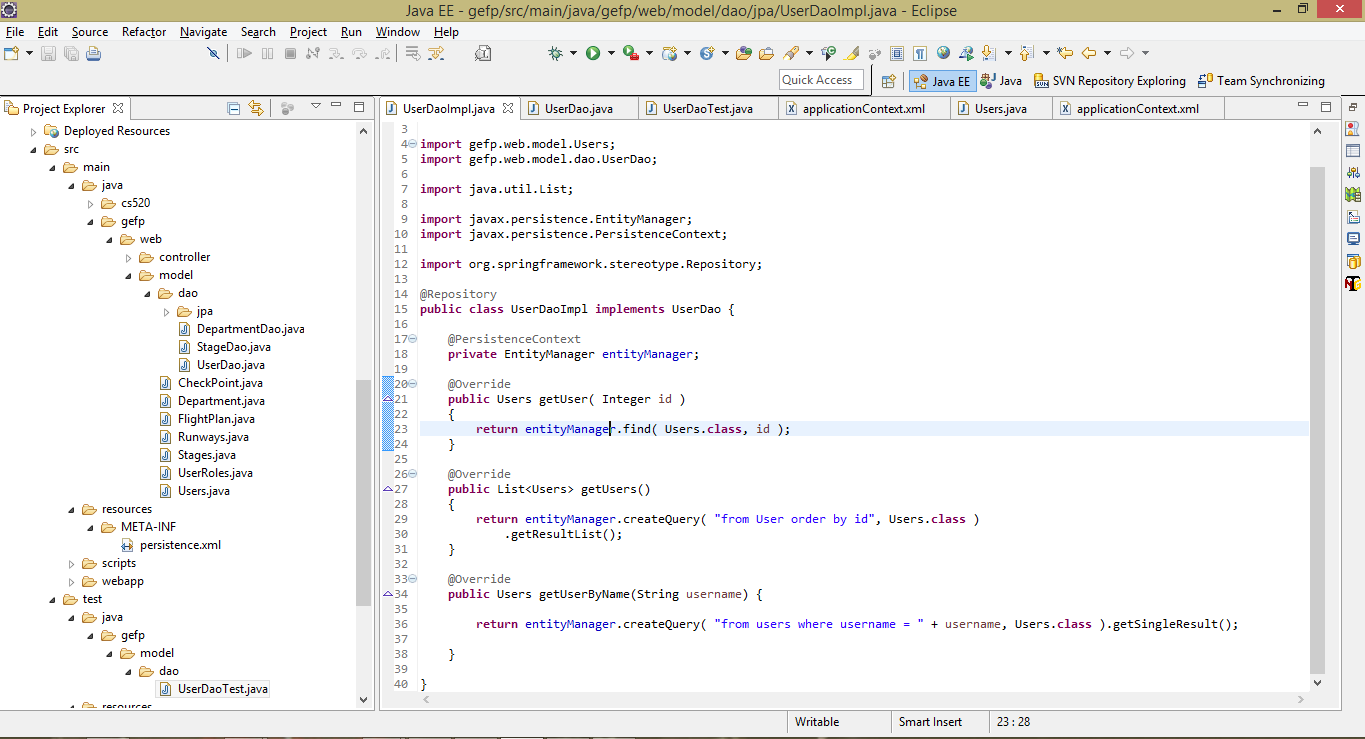 I have checked, its there. I didn't modify anything in the sample code from springmvc, else except for creating the functions as mentioned above. And I also added this function to the UserDao interface. |
