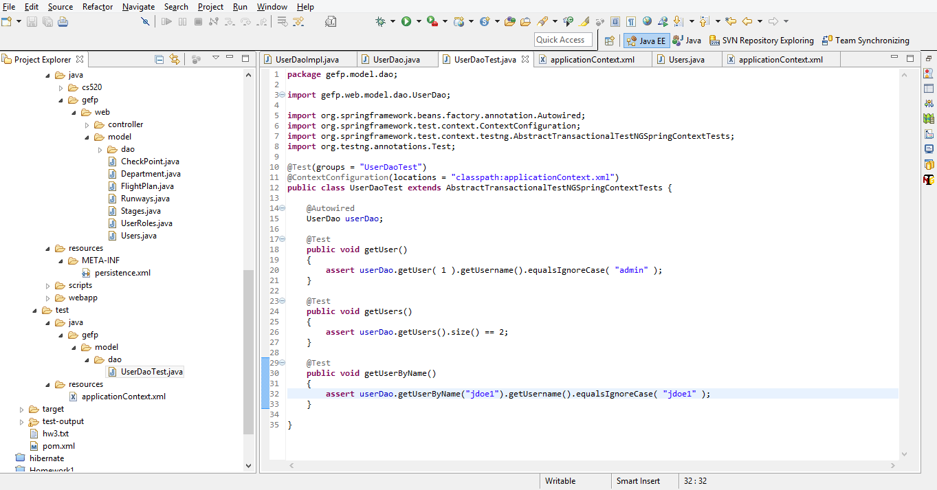 Hi, I have created a function to test if a user with username jdoe1 exists. After running the UserDaoTest for Test NG, I am getting the following error in console. FAILED CONFIGURATION: @BeforeClass springTestContextPrepareTestInstance