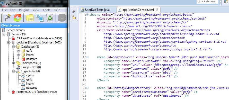 Both my tests are failing because of SQLGrammarException (Implementation of JDBCException indicating that the SQL sent to the database server was invalid (syntax error, invalid object references, etc). From console: Error: INFO: HHH000327: Error performing load command : org.hibernate.exception.SQLGrammarException: could not extract ResultSet I suspect it's related to the configuration of the database: