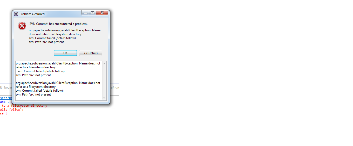 I tried to commit the project and encountered with this problem. org.apache.subversion.javahl.ClientException: Name does not refer to a filesystem directory org.apache.subversion.javahl.ClientException: Name does not refer to a filesystem directory