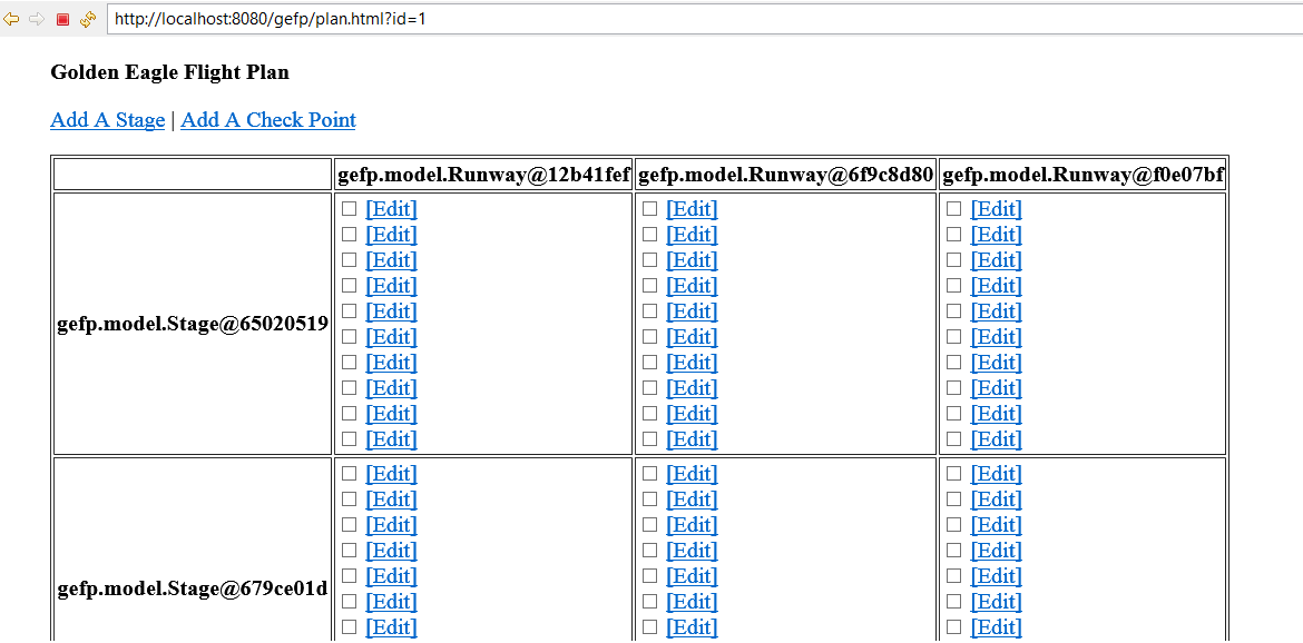 There are several problems in your code, but DAO doesn't seem to be one of them: . You are displaying objects (e.g. ${stage}) when you should display object properties (e.g. ${stage.name}). . You are displaying all the checkpoints in a plan in each cell. . Your Checkpoint probably doesn't have a description property. |