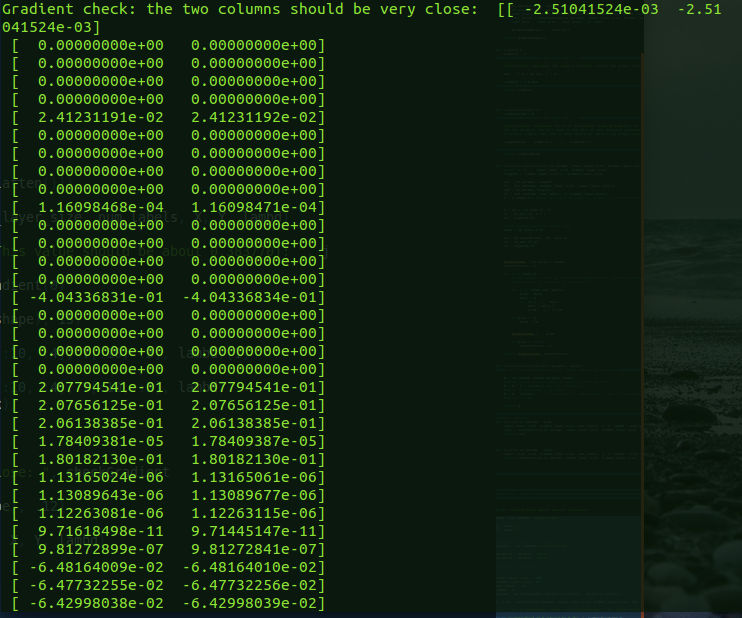 Gradient check only works on the first 3 columns of the y-vector data; digits 1-3. That's okay, as we aren't trying to make a prediction or anything like that: we are just plugging in the same data into two functions to see if the same results come out. All we are doing is checking if the algorithms are implemented correctly. The pdf from Coursera recommends using a smaller neural net for gradient checking, which is what the code does. Here's a printout of what it should look like: you actual numbers might be different, but the columns should be as close as these are. Last edited by msargent at