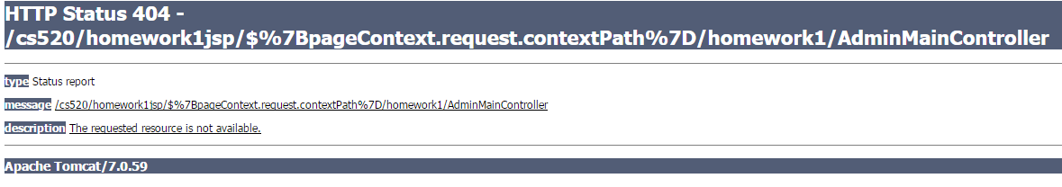 Thanks for the quick response! Here are 2 examples and their error messages attached: <a href="AdminMainController">For Administrators</a> <a href="${pageContext.request.contextPath}/homework1/AdminMainController">For Administrators</a>