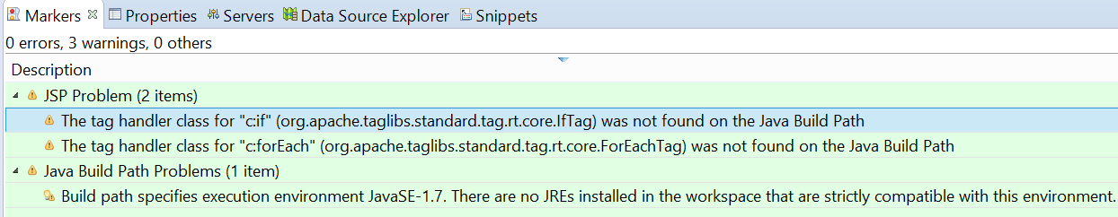 Those seem to be warnings. You can just ignore them. Eclipse's JSP validator sometimes gives false warnings. If the code runs then you can ignore the warnings. The build path warning basically says that the project asks for JDK 1.7 but (presumably) you have JDK 1.8 on your computer. Again, that's perfectly fine. This warning can be disabled in Eclipse Preferences. |