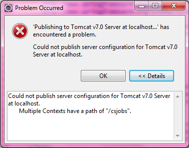 When I try to run my CSJobs project on the server, I get this error: I tried looking in my .xml files to see if there were multiple Context tags using the same path, but didn't find anything. Here is all that is under my WEB-INF: My web.xml looks exactly like the example in the video (so I'm assuming it's okay to post it): In my csjobs-servlet.xml, all I have that references "csjobs" is: <context:component-scan base-package="csjobs.web" />