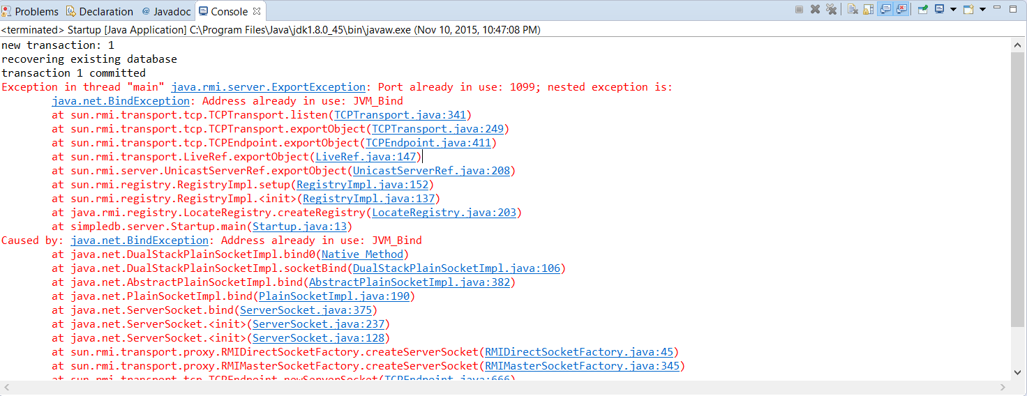 You probably terminated the client but not the server. Switch to the console for the server (see the screenshot in this thread), click the red stop button to terminate it, and then you can run it again. |