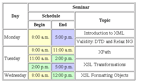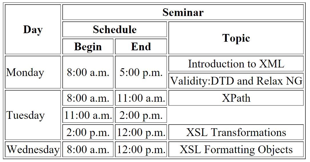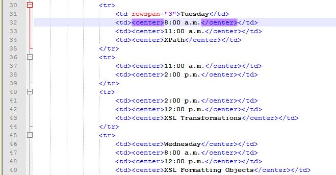 I know its too late but I think you were supposed to have Tuesday have rowspan 6, the times rowspan 2 and XPath/XSL Tansformations rowspan 3. Sorry, I didn't see this until today. |
