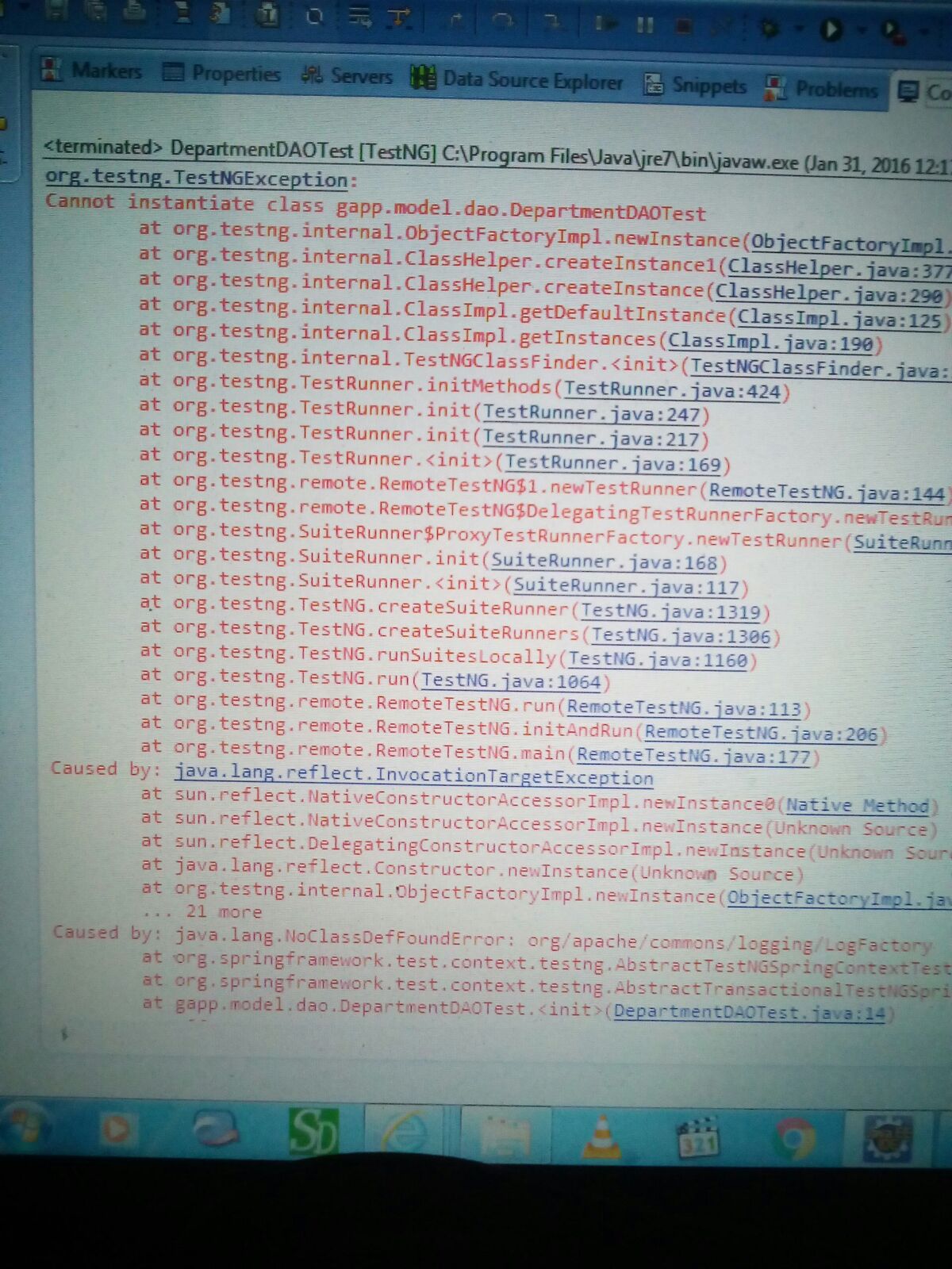 Professor, How to solve this error when I try to run DepartmentDAOTest java file? org.testing.TestNGException: cannot instantiate class gapp.model.dao.DepartmentDAOTest I have already that DepartmentDAOTest in test model. is there any plugin error or anything else i have to do? Last edited by onlinerajnish at