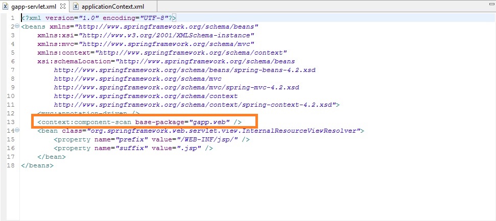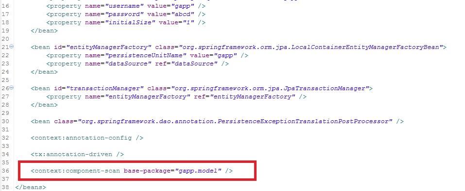 Assuming everything else is correct, it may be because you have two <component-scan> (one in gapp-servlet.xml and one in applicationContext.xml) that scan overlapping packages. Move your model package out of gapp.web to gapp.model. The <component-scan> in gapp-servlet.xml should scan gapp.web and the one in applicationContext.xml should scan gapp.model. |