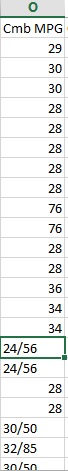 In the milage csv file, MPG columns contain some fractions (i.e. 24/56, 30/50...), which make those column become objects instead of integer/float when importing. If we evaluate the fractions, they will become some numbers less than 1. And it doesn't make any sense for mpg columns. Should I go ahead and replace them with median? |