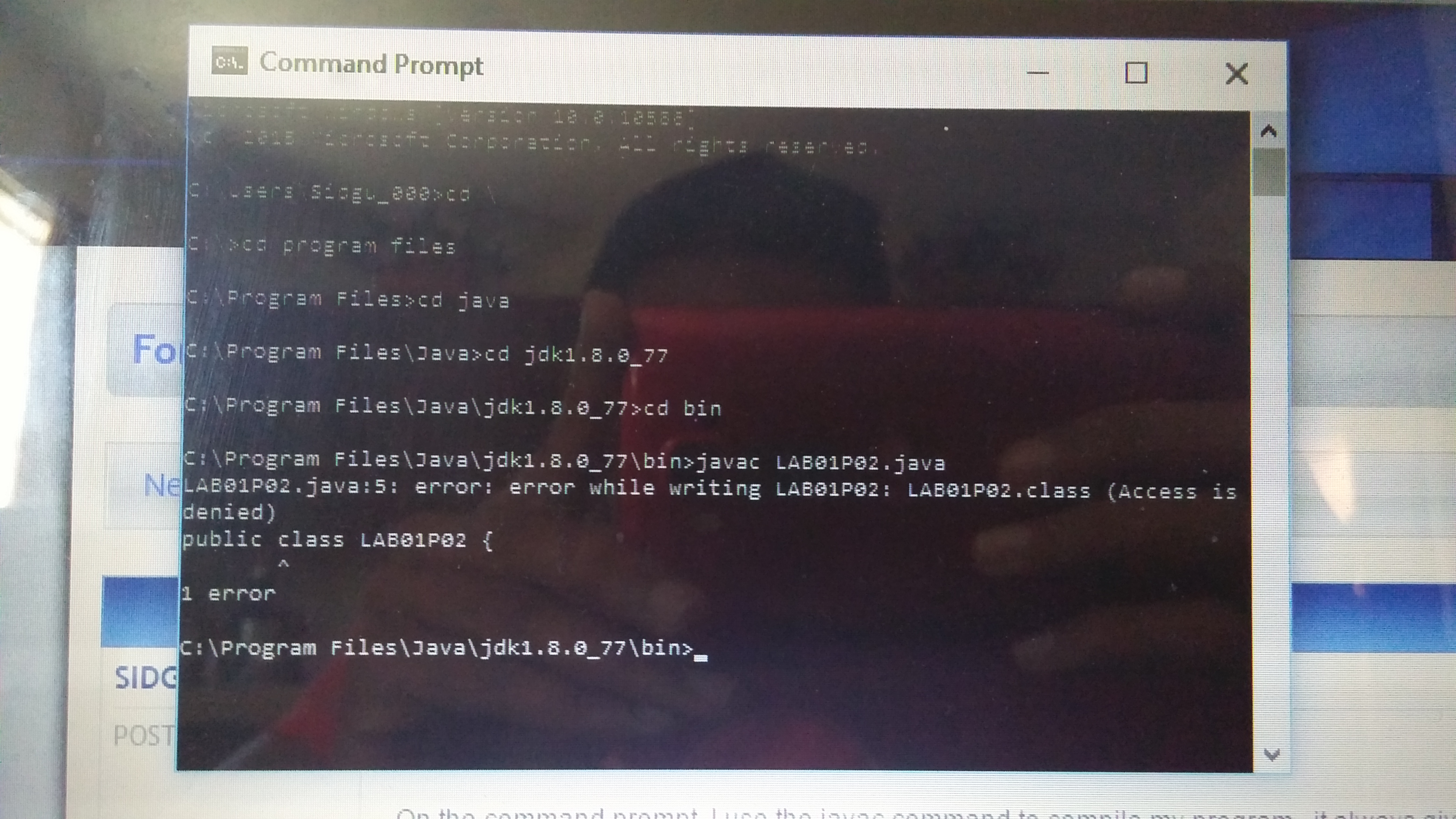 You have to set your PATH variable in the Windows Environment Variable (should be in the instructions for installing Java, or you can Google / look for YouTube video. Assuming this has been done, you shouldn't put your Java code in the folder where you currently have it. Windows likes to keep things locked down, so unless you run the command prompt in admin mode, you won't have write access to things in the program files folder. Store your file on the desktop, in another folder on the C drive or on a flash drive and this should correct the permissions access issue. |