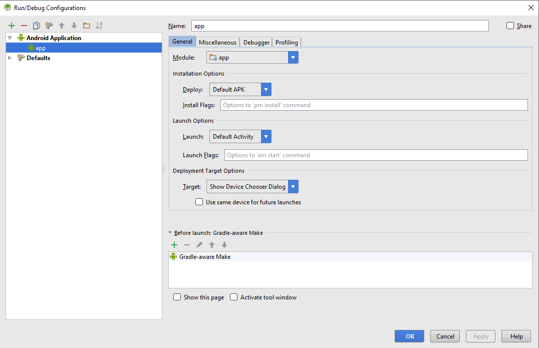 Does anyone know if there's (a) setting(s) in Android Studio that I can change so that app-debug.apk in the output folder would always reflect the most recent change I have made in the IDE? I am using Version 2.1 Preview 4 of Androind Studio. It does not seem to keep the .apk file up-to-date automatically. I had to manually delete the file and re-build to reflect the most recent change to the package. Please see the attached for the current Run config. that I have. Is it the 'Skip installation if APK has not changed' option under 'Installation Options' under 'Miscellaneous' tab?