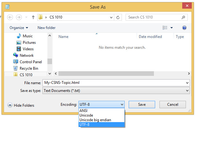 Hello! I just want to note that if anyone else is playing around with the HTML code given in the Lab assignment (8/22/2016), if you're using Notepad to write the code, you may want to save the document with ".htm" or ".html" at the end of the document's name. Also, you might need to change the encoding to UTF-8 instead of ANSI. Check out the attached picture.