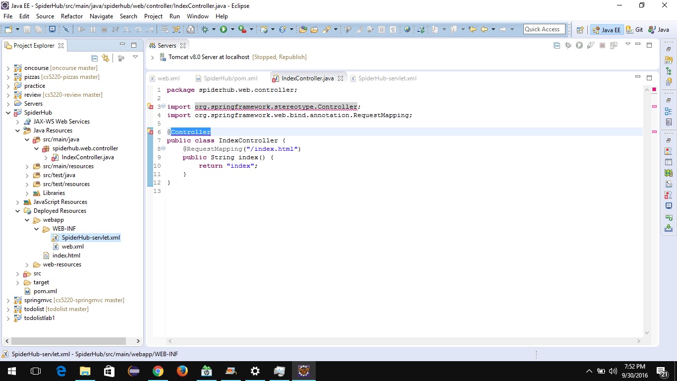 Hello Dr.Sun i am following step 1-3 of Spring and Hibernate From Scratch. now when i added spring-webmvc:4.3.2 as dependency in pom.xml,it gives me error message "The import org.springframework.stereotype.Controller cannot be resolved" when i try to give annotation in indexcontroller.java class ,but works well with 4.2.2 release. what should i do? Thank you |