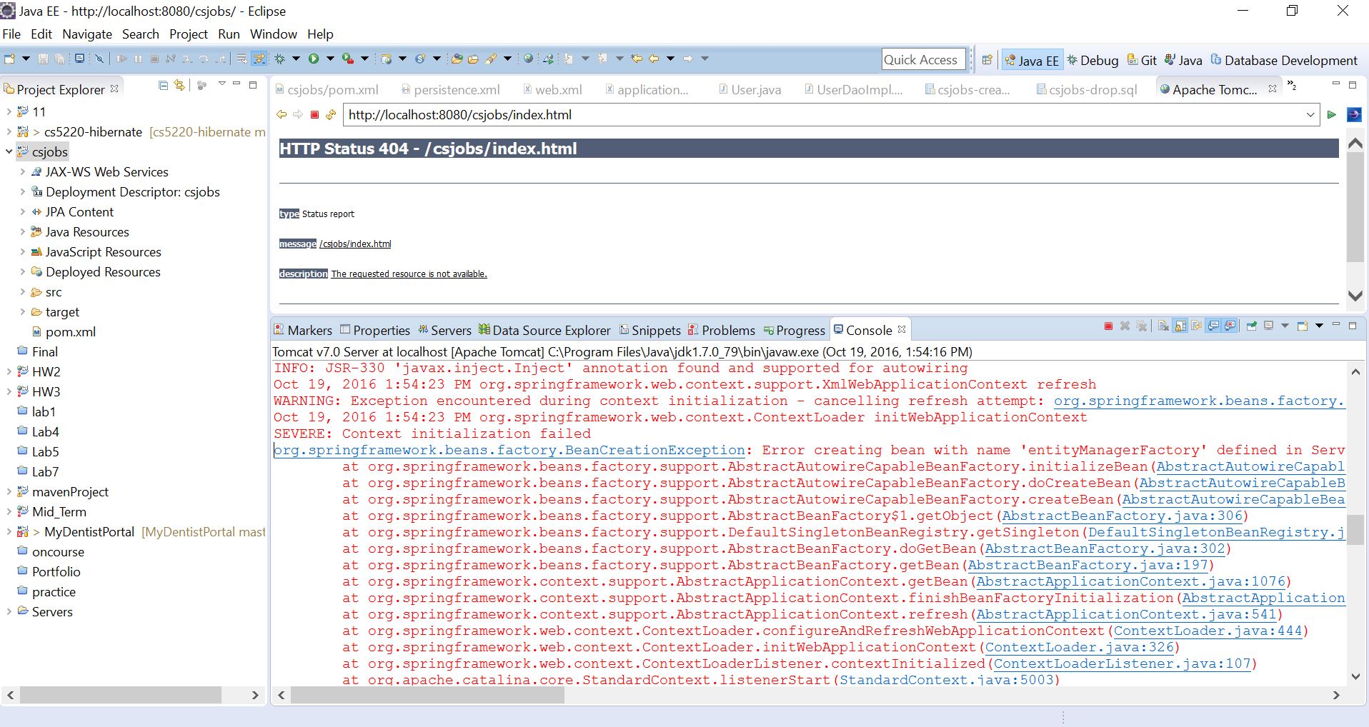 org.springframework.beans.factory.BeanCreationException: Error creating bean with name 'entityManagerFactory' defined in ServletContext resource [/WEB-INF/applicationContext.xml]: Invocation of init method failed; nested exception is java.lang.IllegalArgumentException: Error loading class [org.hibernate.jpa.HibernatePersistenceProvider]: problem with class file or dependent class. Oct 19, 2016 2:08:17 PM org.apache.catalina.core.StandardContext listenerStart |