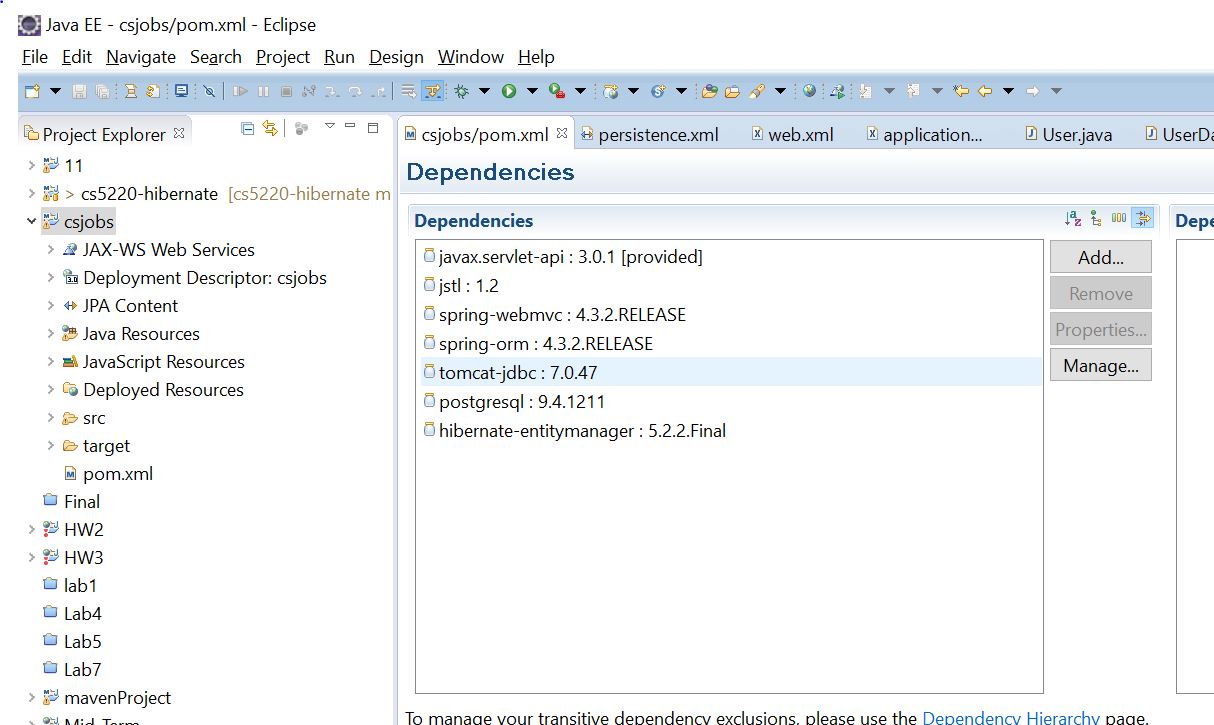 java.lang.UnsupportedClassVersionError: org/hibernate/jpa/HibernatePersistenceProvider : Unsupported major.minor version 52.0 (unable to load class org.hibernate.jpa.HibernatePersistenceProvider) It has something to do with JDK version. Assuming you are running JDK 1.8, try changing the maven-compiler-plugin configuration in pom.xml to <target>1.7</target> or <target>1.8</target>, then do a Maven update project. |
